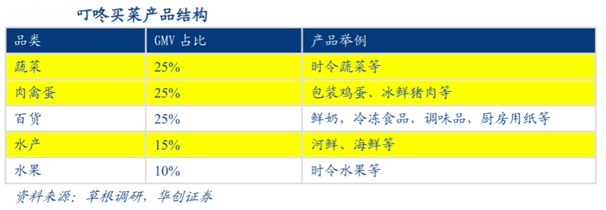經(jīng)典案例:據(jù)草根調(diào)研、華創(chuàng)證券等綜合資訊顯示,從產(chǎn)品結(jié)構(gòu)看,叮咚買菜的品類構(gòu)成更接近菜市場(chǎng)業(yè)態(tài)。叮咚買菜著眼蔬菜、肉禽蛋等日常做飯所需食材,并極其 強(qiáng)調(diào)新鮮,以水產(chǎn)為突破,通過(guò)活蝦、活魚(yú)等差異化產(chǎn)品迅速打開(kāi)市場(chǎng)提升口碑;其他眾多平臺(tái)仍以冷凍肉為主,而叮咚買菜主推冰鮮豬肉。每日優(yōu)鮮以水果為主要品類,水果品類 GMV 占比 40%,食品百貨 GMV 占比 40%。
