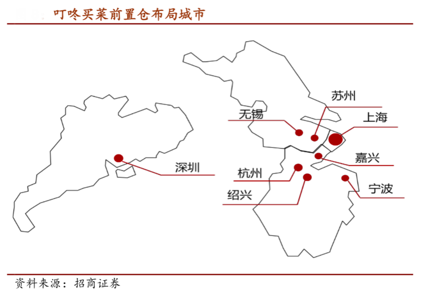 經(jīng)典案例:根據(jù)草根調(diào)研、招商證券等綜合資訊表明,叮咚買菜采取“前置倉+到家”模式,將前置倉布局在供應(yīng)鏈末端最靠近消費(fèi)者的一個節(jié)點,周邊住戶數(shù)量在兩三萬左右就能開倉,以此讓生鮮離消費(fèi)者更近,配送效率更高,最快 29 分鐘就能送貨到家。