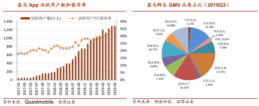 根據(jù)Questmobile、燃數(shù)科技、招商證券等綜合資訊表明,根據(jù)侯毅在投資者大會上披露,盒馬年度活躍 買家已達(dá) 2000 萬,核心消費(fèi)者在盒馬的年度消費(fèi)在 3000 元人民幣以上。從商品構(gòu)成 看,根據(jù)燃數(shù)科技數(shù)據(jù),2019Q3 盒馬鮮生線上 GMV 中生鮮占比達(dá)到 77%,前三大品 類分別為新鮮水果、海鮮水產(chǎn)、乳品烘焙。