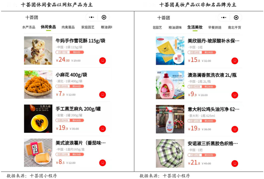 據(jù)十薈團(tuán)小程序等綜合資訊表明,多家社區(qū)拼團(tuán)平臺(tái)官方披露的總 SKU 數(shù)有上萬(wàn)種,但通過(guò)小程序下單的過(guò)程中發(fā)現(xiàn)單個(gè)團(tuán)長(zhǎng)提供的 SKU 數(shù)基本不超過(guò) 200 個(gè),大部分只有幾十個(gè), 選品以爆款生鮮產(chǎn)品為主,部分產(chǎn)品的定價(jià)非常有殺傷力。