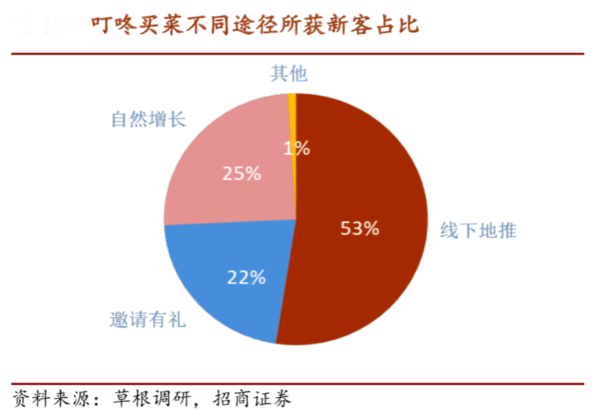 經(jīng)典案例:根據(jù)草根調(diào)研、招商證券等綜合資訊顯示,叮咚買(mǎi)菜獲客途徑以線下地推為主,通過(guò)線下地推所獲新客占比過(guò)半,通過(guò)邀請(qǐng)有禮所獲新客與自然增長(zhǎng)各占約 1/4。叮咚買(mǎi)菜把線下地推作為進(jìn)入新城市的冷啟動(dòng)方式,獲取第一批穩(wěn)定的種子用戶(hù)后,再通過(guò)線上老用戶(hù)拉新用戶(hù)進(jìn)一步獲取新客。