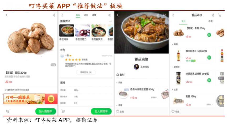 經(jīng)典案例:根據(jù)叮咚買(mǎi)菜APP、招商證券等的資訊顯示,叮咚買(mǎi)菜 APP用戶(hù)點(diǎn)擊每一個(gè)單品,商品詳情的下方都會(huì)顯示“推薦做法”, 同時(shí)給出對(duì)應(yīng)食材和調(diào)料的購(gòu)買(mǎi)鏈接,方便用戶(hù)一站式購(gòu)齊菜譜食材,進(jìn)而提高客單價(jià)。