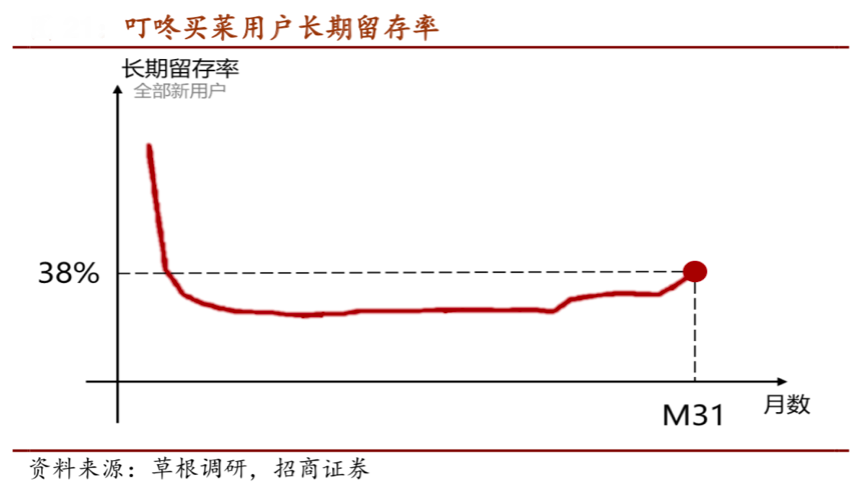 經(jīng)典案例:根據(jù)草根調(diào)研、招商證券等的資訊顯示,叮咚買(mǎi)菜第31個(gè)月長(zhǎng)期留存率翹尾到 38%,老用戶(hù)月均消費(fèi) 6.5 次,處于行業(yè)領(lǐng)先地位。