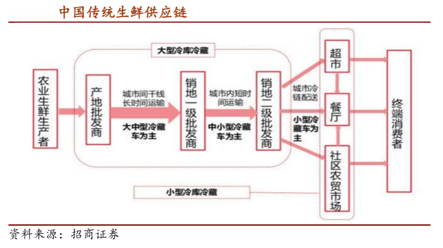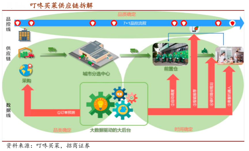 經典案例:據(jù)招商證券等資訊顯示,叮咚買菜的供應鏈經過三段運輸:首先產品從源頭出發(fā),經冷鏈運輸?shù)匠鞘蟹诌x中心,之后再運輸?shù)角爸脗},最后用末端配送把商品配送到用戶家里。整條供應鏈為用戶創(chuàng)造了三段價值:從源頭到分選中心,實現(xiàn) B2B 生鮮電商的價值;從分選中心到前置倉,實現(xiàn)生鮮超市做的價值;從前置倉配送到用戶家里,實現(xiàn)外賣平臺的價值。