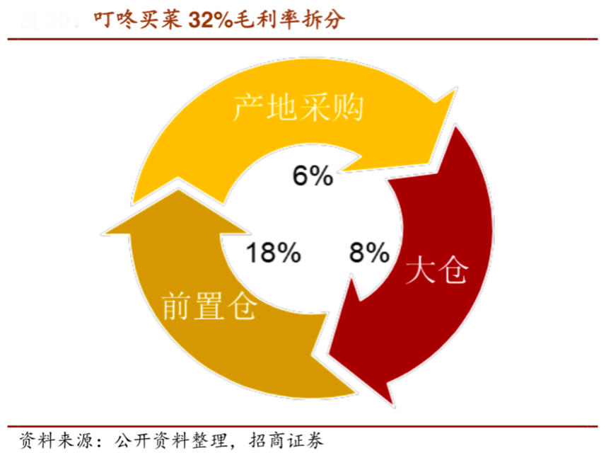 經典案例:據(jù)招商證券等資訊顯示,叮咚買菜最新的毛利率為 32%,來自3段低毛利率的總和:從產地采購獲取6%的毛利率;從大倉的加工、生產、運輸獲取 8%的毛利率;從前置倉獲取18%的毛利率。
