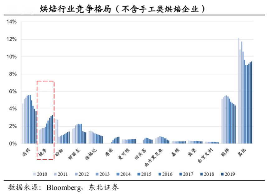 品牌化,有黏性,有認(rèn)知,可信賴(lài)。全國(guó)性烘焙食品企業(yè)多是長(zhǎng)保質(zhì)期的食品企業(yè),根據(jù)Bloomberg、東北證券等綜合資訊表明,烘焙行業(yè)競(jìng)爭(zhēng)格局鮮明,三類(lèi)市場(chǎng)競(jìng)爭(zhēng)者比較突出,以達(dá)利、盼盼、好麗友為代表的長(zhǎng)保企業(yè),以桃李、賓堡、義利為代表的短保企業(yè),及手工類(lèi)烘焙門(mén)店。手工類(lèi)烘焙門(mén)店目前占據(jù)極大市場(chǎng)份額,為72.8%。工業(yè)化生產(chǎn)企業(yè)占據(jù)約27%的市場(chǎng)份額。從產(chǎn)品屬性來(lái)看,短保類(lèi)更加聚焦于早餐市場(chǎng),中長(zhǎng)保類(lèi)更加聚焦于休閑食品市場(chǎng),但無(wú)論何種市場(chǎng)競(jìng)爭(zhēng)參與者,均都強(qiáng)調(diào)“品牌化行銷(xiāo)”,以品牌提升用戶(hù)黏性。