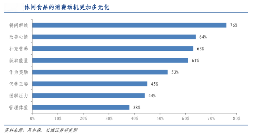 休閑食品經(jīng)過多年發(fā)展,消費場景已經(jīng)大大增加,從原有傳統(tǒng)的充饑解餓、獲取能量向更多的品質(zhì)、享受及壓力緩解等發(fā)展,“泛休閑”的消費場景打造已經(jīng)成為各休閑食品品牌營銷策劃的主要驅(qū)動力。根據(jù)尼爾森、長城證券研究所等綜合資訊表明,休閑食品的消費動機更加多元化,3/4 以上的全球消費者吃零食是為了在兩餐之間消除饑餓感,63%是為了補充營養(yǎng),45%的人們會代替正餐,還有相當(dāng)一部分人為了緩解壓力、管理體重,消費群體也從兒童、老人等擴大到購買力更強的年輕白領(lǐng),休閑食品的消費日益多元化。