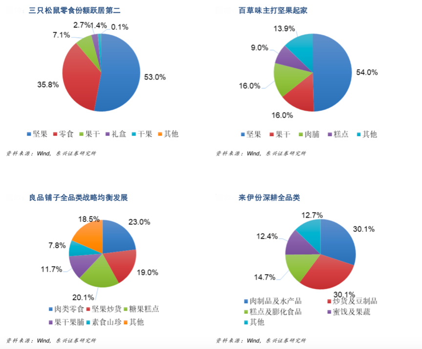 經(jīng)典案例:根據(jù)wind、東興證券研究所等綜合資訊表明,三只松鼠自 2012 年主打堅果起家,隨即引爆休閑食品電商平臺,2014 年其拓展業(yè)務(wù)至干果、花茶等周邊產(chǎn)品。百草味亦主打堅果起家,2013 年堅果收入占比72.47%,至 2017 年已降至 54%,果干/肉脯/糕點分占 16%/16%/9%。良品鋪子始終主打全品類戰(zhàn)略,布局更為廣泛均衡,SKU 逾 1200 種。