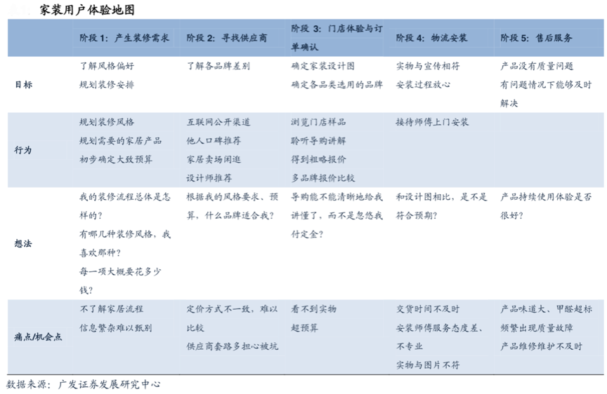 家裝用戶體驗(yàn)驅(qū)動(dòng)著家裝新零售平臺(tái)的進(jìn)化,推動(dòng)家裝新零售新服務(wù)的迭代升級(jí)。據(jù)廣發(fā)證券發(fā)展研究中心等綜合資訊顯示,從“家裝用戶體驗(yàn)地圖”我們可以看出,家裝消費(fèi)因購買產(chǎn)品不同而擁有不同的“品牌體驗(yàn)訴求”,對(duì)于整體櫥柜、整體衣柜等硬裝產(chǎn)品要求強(qiáng)烈的品質(zhì)背書、品牌內(nèi)容閱讀及高價(jià)值傳遞,從原來單一的商品交易向“多樣化的內(nèi)容互動(dòng)、品牌主題策劃活動(dòng)及線上線下聯(lián)動(dòng)”升級(jí);而對(duì)于沙發(fā)、茶幾、餐桌、床墊等軟裝產(chǎn)品,“溝通接觸-訂單確認(rèn)-物流配送-安裝售后”的購買流程相對(duì)簡單,從單一的商品交易則向“風(fēng)格界定-品牌選擇-產(chǎn)品篩選-交易促進(jìn)-服務(wù)分享”等簡化流程、強(qiáng)化主題品牌策劃的互動(dòng)推進(jìn)升級(jí),從關(guān)注商品本身到線上線下營銷策劃聯(lián)動(dòng)、高價(jià)值服務(wù)升級(jí)等。