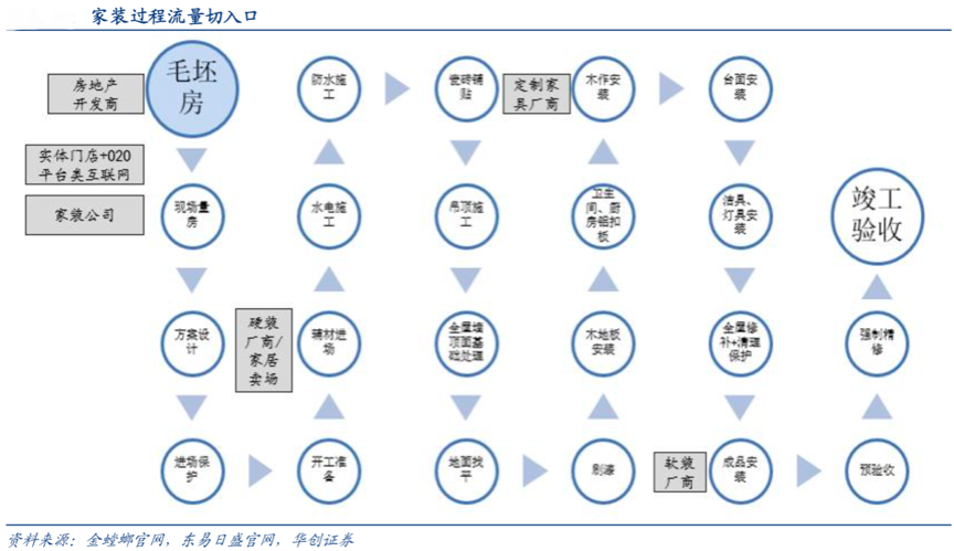 家裝新零售新服務(wù)旨在強(qiáng)化家裝新服務(wù)的多流量入口,放大家裝測量、設(shè)計(jì)、水電處理、家裝處理等“全家裝周期服務(wù)”,提升用戶的整體家裝滿意度。根據(jù)金螳螂官網(wǎng)、東易日盛官網(wǎng)、華創(chuàng)證券等綜合資訊表明,整體裝修從毛坯房到竣工驗(yàn)收按照流量入口切入程度依次為“房地產(chǎn)開發(fā)商→家裝公司實(shí)體門店或平臺(tái)類互聯(lián)網(wǎng) →家裝公司→家居賣場或硬裝材料商→定制家具廠商→軟裝材料商”,其中房地產(chǎn)開發(fā)商、家裝公司和定制家具廠商為主要的三個(gè)流量切入口。直接切入房地產(chǎn)開發(fā)商精裝修項(xiàng)目可以從最源頭攫取流量,這是最有效的一種方式。家裝新零售新服務(wù)就要?jiǎng)?chuàng)造家裝多流量新入口,亮化用戶全家裝周期消費(fèi)體驗(yàn)。