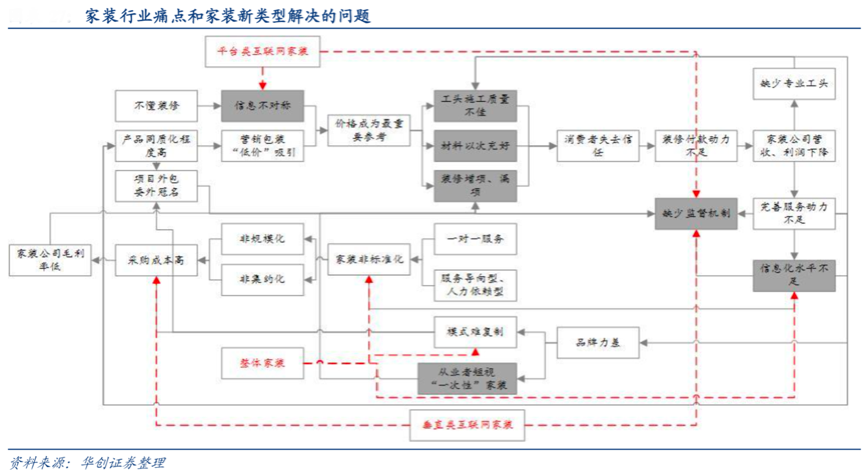 家裝新零售新服務(wù)解決了行業(yè)性痛點(diǎn),以“整裝標(biāo)準(zhǔn) 個(gè)性裝配”來滿足用戶的個(gè)性化家裝需求。根據(jù)華創(chuàng)證券等綜合資訊表明,家裝行業(yè)痛點(diǎn)集中表現(xiàn)為:非標(biāo)準(zhǔn)化產(chǎn)品,服務(wù)鏈條長、層層加價(jià);價(jià)格優(yōu)勢不明顯;供應(yīng)鏈整合難度大,家裝新零售新服務(wù)改變了傳統(tǒng)家裝行業(yè)效果依賴于人、客戶的需求個(gè)性化、服務(wù)非標(biāo)準(zhǔn)化等現(xiàn)狀,推進(jìn)標(biāo)準(zhǔn)化家裝,提供限定套餐、限定報(bào)價(jià)、限定設(shè)計(jì),將家裝設(shè)計(jì)方案進(jìn)行風(fēng)格細(xì)分、材質(zhì)細(xì)分、檔次細(xì)分等,以此滿足對(duì)用戶個(gè)性化家居裝修需求。