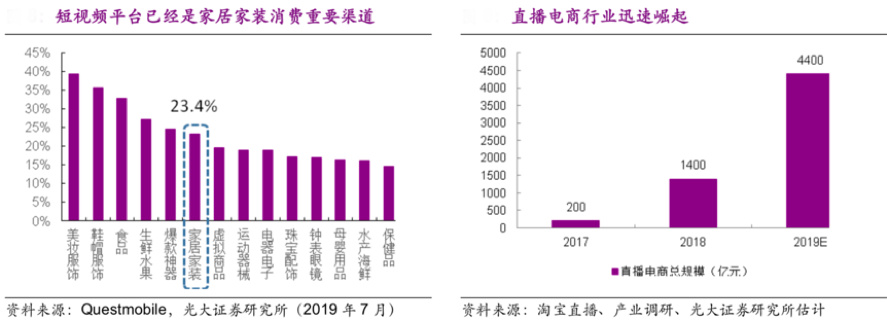 我們已經(jīng)進(jìn)入了家裝新零售“品牌化內(nèi)容行銷”時(shí)代,家裝產(chǎn)品、裝修特色等家裝新服務(wù)倍受用戶關(guān)注。家裝內(nèi)容營銷的崛起,既滿足了消費(fèi)者快速學(xué)習(xí)家居裝修關(guān)鍵點(diǎn)的需求,又提升了家居消費(fèi)的曝光度。從消費(fèi)者家居消費(fèi)的內(nèi)在決策邏輯來看,家居消費(fèi)長期低頻、短期高頻,要求消費(fèi)者花較多時(shí)間在互聯(lián)網(wǎng)學(xué)習(xí)專業(yè)知識(shí)。根據(jù)Questmobile、光大證券研究所等綜合資訊顯示,短視頻平臺(tái)已經(jīng)成為家居家裝消費(fèi)的重要渠道,同時(shí)根據(jù)淘寶直播、產(chǎn)業(yè)調(diào)研和光大證券研究所等綜合資訊顯示,直播電商行業(yè)迅速崛起,主播通過短視頻高效輸出家居裝修的關(guān)鍵點(diǎn),提高消費(fèi)者的決策效率。