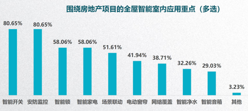 根據(jù)阿里云IoT事業(yè)部、中國智能家居產(chǎn)業(yè)聯(lián)盟CSHIA、新浪家居聯(lián)合編制的《2019中國智能家居發(fā)展白皮書》等綜合資訊表明,圍繞房地產(chǎn)項目的全屋智能室內(nèi)應(yīng)用重點比較明顯,智能開關(guān)應(yīng)用占80.65%,安防監(jiān)控等基礎(chǔ)性智能家居需求在80.65%,智能鎖在58.06%,地產(chǎn)商對于智能家居的硬件應(yīng)用尚處于基礎(chǔ)階段,智能鎖、智能開關(guān)等處于主流應(yīng)用地位。
