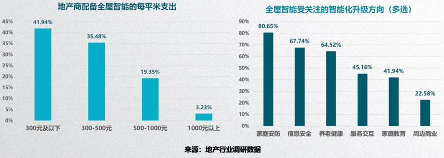 根據(jù)阿里云IoT事業(yè)部、中國智能家居產(chǎn)業(yè)聯(lián)盟CSHIA、新浪家居聯(lián)合編制的《2019中國智能家居發(fā)展白皮書》等綜合資訊表明,受調(diào)研地產(chǎn)商對于配備全屋智能的每平米成本支出集中于300元以下,300-500元區(qū)間。家庭安防、養(yǎng)老健康與信息安全,被視作全屋智能重要的功能升級方向,這些表明“全屋智能”需要迭代升級,升級智能類家居消費體驗,強調(diào)家庭安防、信息安全等基礎(chǔ)的智能商品及配置,升級智能家居產(chǎn)品應(yīng)用。