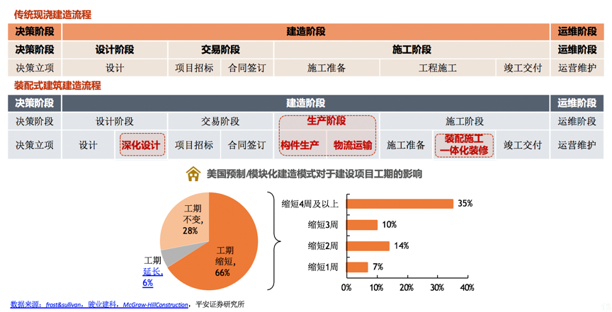 “輕鋼房屋”企業(yè)要想快速發(fā)展,就要充分發(fā)揮“輕鋼房屋”的優(yōu)勢,放大“輕鋼全屋”的亮點(diǎn),激活“輕鋼房屋+輕鋼家裝”的商業(yè)價值。根據(jù)frost&fullivan、駿業(yè)建科、平安證券研究所等綜合資訊表明,相比于傳統(tǒng)的工程建造模式,“輕鋼房屋”通過在前期進(jìn)行深化設(shè)計(jì)與標(biāo)準(zhǔn)化設(shè)計(jì),將建筑物拆分為標(biāo)準(zhǔn)化部品部件,在工廠中提前批量生產(chǎn)部件部品,再運(yùn)輸至工程現(xiàn)場進(jìn)行組裝,從而縮短了現(xiàn)場建造周期(裝配式建造方法較傳統(tǒng)建造方式縮 短1/3以上工期)。并以前期定制化設(shè)計(jì)、構(gòu)件式生產(chǎn)和一體化裝修提高了“輕鋼房屋”的建造效率,提升了用戶房屋快速建、舒適家裝的體驗(yàn),這正是此品類的“一大特色”。