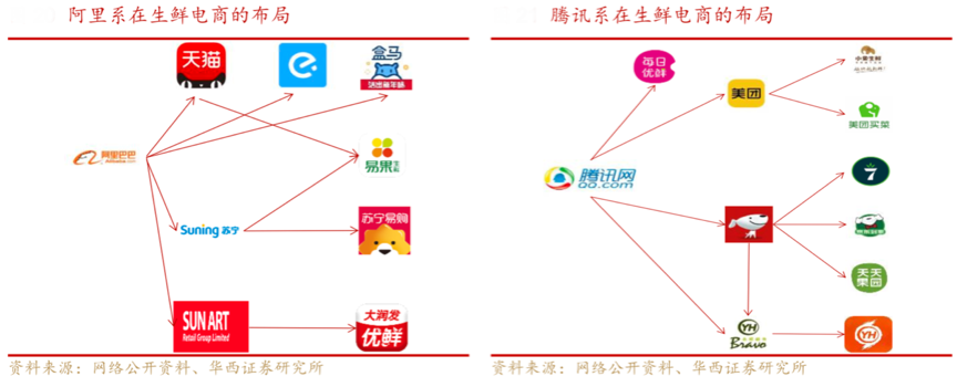 國內(nèi)生鮮互聯(lián)網(wǎng)平臺持續(xù)占據(jù)著競爭優(yōu)勢,BAT等互聯(lián)網(wǎng)巨頭的“生鮮生態(tài)經(jīng)營”高效推進。根據(jù)網(wǎng)絡(luò)公開資料、華西證券研究所等綜合資訊表明,阿里直接控股和自建的方式進入生鮮電商領(lǐng)域,包括自建盒馬鮮生,持股高鑫零售(大潤發(fā)優(yōu)選)和蘇寧(蘇寧易購)、收購餓了么、通過天貓和蘇寧投資易果等;騰訊系通過與京東、永輝超市、美團合作的方式進行生鮮電商的布局,并且直接投資了每日優(yōu)鮮。互聯(lián)網(wǎng)巨頭布局相對完整,生鮮電商新零售平臺策劃經(jīng)營成了“巨頭游戲”。