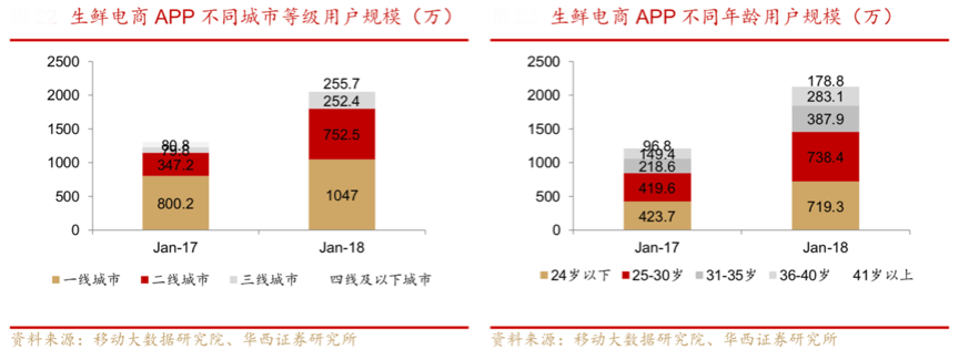 生鮮消費用戶量持續(xù)增長,年輕化特征明顯,生鮮時尚化、品質(zhì)化和年輕化消費特征突出。根據(jù)移動大數(shù)據(jù)、華西證券研究所等綜合資訊表明,在 2017 年 8 月-2018 年 8 月期間,生鮮電商在三四線及以下城市用戶規(guī)模增長在 200%以上,36歲以上人群用戶增長接近90%,隨著冷鏈物流的發(fā)展,生鮮電商的布局下沉,以及隨著年齡增長和消費習(xí)慣的培養(yǎng),生鮮電商有望保持高速增長,在生鮮消費中的占比將持續(xù)提升。