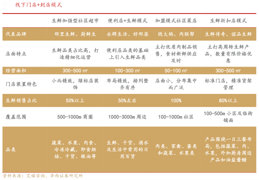 根據(jù)艾媒咨詢、華西證券研究所等綜合資訊表明,到家模式、社區(qū)團購模式、線下門店+到店模式等生鮮電商新零售模式風(fēng)行國內(nèi),尤其是“線下門店+到店”模式,該模式下的四種門店類型基本覆蓋社區(qū)、商圈100-3000m,貼近社區(qū)增加消費便利性,生鮮銷售占比基本在 50% 以上,基本圍繞家庭高頻消費的蔬菜、水果、肉蛋類商品為主,門店裝飾和布局一般較為精致,提升消費體驗,引領(lǐng)生鮮行業(yè)創(chuàng)新風(fēng)尚。