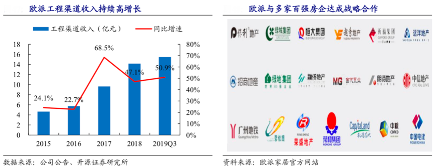 經(jīng)典案例:根據(jù)公司公告、開源證券研究所、歐派家居官網(wǎng)等綜合資訊表明,2019 年前三季度,歐派公司大宗業(yè)務(wù)收入 15.5 億元,同比增長 50.8%,其已與萬科、綠城、恒大等多家國內(nèi)知名百強房企建立了長期戰(zhàn)略合作關(guān)系。根據(jù)公司官網(wǎng)數(shù)據(jù),地產(chǎn)百強企業(yè)中同歐派簽訂戰(zhàn)略合作協(xié)議的有 20 多家,長期合作的約有 70 多家。