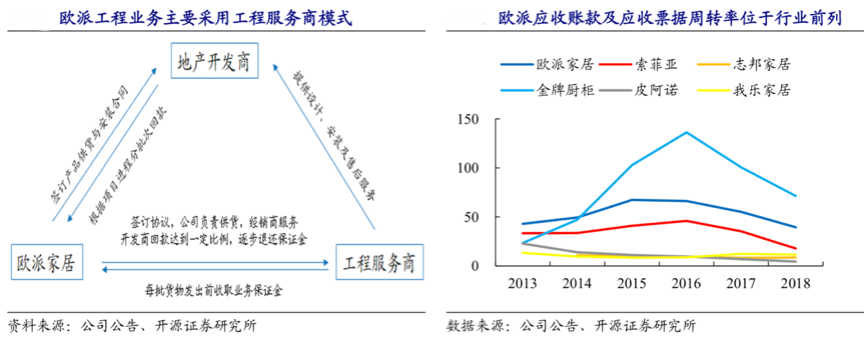 同時,根據(jù)公司公告、開源證券研究所等綜合資訊表明,歐派的大宗業(yè)務(wù)主要采用工程服務(wù)商模式。在項目過程中,工程服務(wù)商除先行承擔設(shè)計、安裝及 售后服務(wù)發(fā)生的所有相關(guān)費用外,還需為該項目中公司尚未收到的凈應(yīng)收貨款提供 相應(yīng)等額的保證金。歐派優(yōu)質(zhì)的工程服務(wù)商隊伍和全國化產(chǎn)能布局也保證 了歐派工程端出色的交付能力。