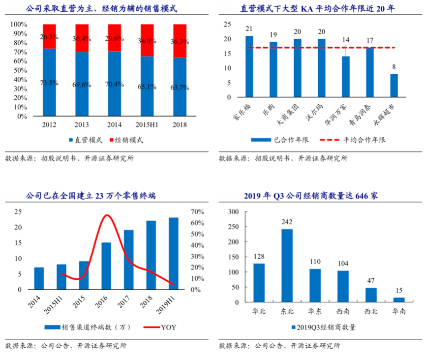 經(jīng)典案例:根據(jù)公司公告、招股說明書、開源證券研究所等綜合資訊表明,“桃李面包”與沃爾瑪、大潤發(fā)等大型商超之間的合作年限已將近 20 年,積累了產(chǎn)品鋪貨速度、陳列規(guī)模占比、訂單反饋及時性等方面的競爭優(yōu)勢。并要求與公司合作的經(jīng)銷商只能銷售桃李品牌面包,不能售賣其他品牌,具備較強的排他性。截至 2019 年 Q3 公 司已在東北、華北、西北、西南、華東等 17 個中心城市建立約 23 萬個零售終端,經(jīng)銷商數(shù)量已經(jīng)達(dá)到 646 家。