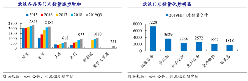 經(jīng)典案例:根據(jù)公司公告、開(kāi)源證券研究所等綜合資訊表明,歐派各品類門店數(shù)量逐步增加,歐派門店數(shù)量?jī)?yōu)勢(shì)明顯,定制家居屬于“產(chǎn)品+服務(wù)”模式,終端服務(wù)鏈條長(zhǎng)。截至 2019Q3,歐派共有 門店合計(jì) 7335 家(包括整裝大家居 251 家),歐派的門店總數(shù)接近行業(yè)第二位的 2 倍,門店規(guī)模優(yōu)勢(shì)明顯。