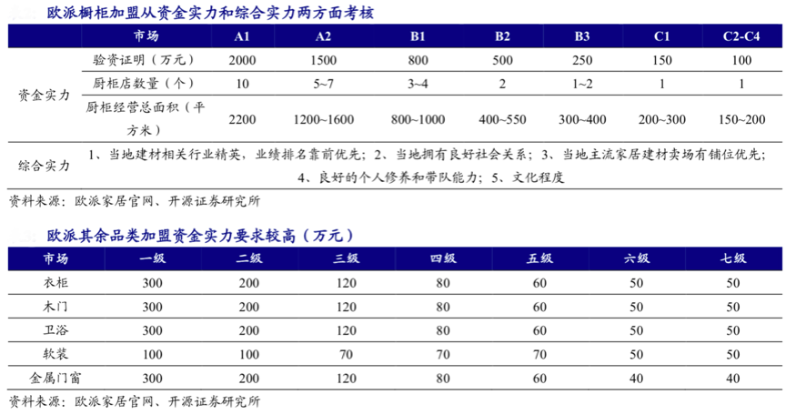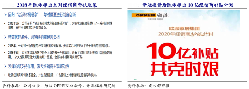 經(jīng)典案例:根據(jù)歐派家居官網(wǎng)、開(kāi)源證券研究所等綜合資訊表明,歐派櫥柜從資金實(shí)力和綜合實(shí)力兩方面考核加盟商,分品類對(duì)加盟商進(jìn)行資金實(shí)力抬升要求,同時(shí)推出系列化的經(jīng)銷商幫扶政策,從經(jīng)營(yíng)理念、代理篩選、總部支持及補(bǔ)貼計(jì)劃等方面強(qiáng)化對(duì)經(jīng)銷商的大力支持,定制家居快速發(fā)展的過(guò)程就是“廠商協(xié)同作戰(zhàn)”的過(guò)程。