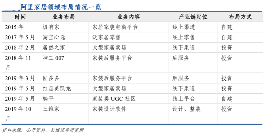 經(jīng)典案例:阿里是國內(nèi)知名的互聯(lián)網(wǎng)巨頭,根據(jù)公開資料、長城證券研究所等綜合資訊表明,其自2015年起開始試水家居布局,從家居家裝電商經(jīng)營切入,大量布局家居零售賣場,并于2018年投資“神工007”進入“家裝后服務(wù)領(lǐng)域”,于2019年自建“躺平APP”,投資“三維家”,涉及家裝UGC和家裝設(shè)計軟件領(lǐng)域,使阿里家居新零售布局完成“家居新零售產(chǎn)業(yè)鏈”的“全鏈式布局”,產(chǎn)業(yè)鏈經(jīng)營優(yōu)勢大幅提升。