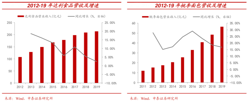 “吃得健康&吃出品質(zhì)”是食品消費的“行業(yè)基礎(chǔ)性消費標配”之一,各大企業(yè)紛紛強化健康原料的植入、環(huán)保工藝的加入等,放大食品的品質(zhì)價值和品牌價值,因各品類不同消費特性呈現(xiàn)不同商業(yè)價值。根據(jù)wind、中泰證券研究所等綜合資訊顯示,從健康化的消費趨勢來看,短保品由于其新鮮、健康等優(yōu)勢,容易占領(lǐng)更多市場份額。從上市公司的業(yè)績表現(xiàn)來看,國內(nèi)長保烘焙的龍頭達利食品的烘焙糕點類收入從 2016 年開始進入增長瓶頸,2017 年甚至開始 出現(xiàn)下滑(同比 2.45%)。