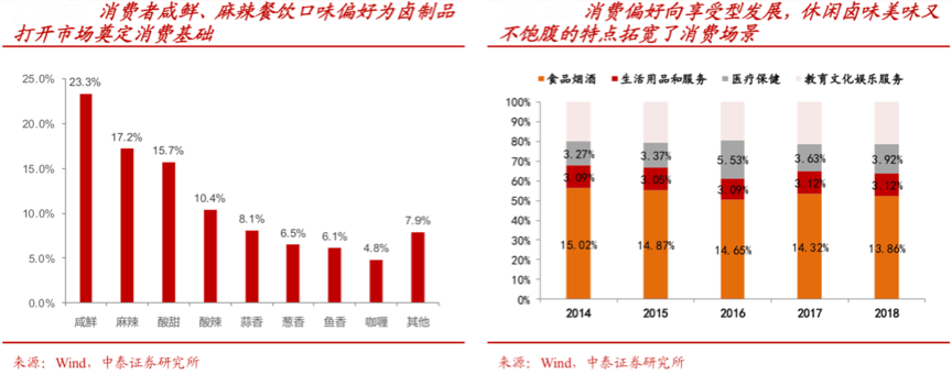 隨著食品消費偏好向享受型發(fā)展,休閑鹵味美味又不飽腹的特點拓寬了食品消費的“大場景”,從餐桌佐菜到社交零食,食品消費頻次有望隨著品質(zhì)型消費升級而陸續(xù)提升,根據(jù)wind、中泰證券研究所等綜合資訊顯示,消費者的口味關(guān)注度比較高,對食品消費的影響力比較大,以鹵制品行業(yè)為例,消費者咸鮮、麻辣餐飲口味偏好為鹵制品,這就為其打開市場奠定了消費基礎(chǔ)。