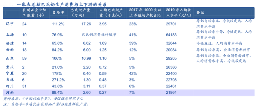 從區(qū)域乳品企業(yè)的經(jīng)營現(xiàn)狀來看,區(qū)域乳品企業(yè)大多久經(jīng)激烈的市場競爭考驗,紛紛搶占奶源基地,強化奶源、強化冷鏈基地建設(shè)等是各區(qū)域乳品企業(yè)極為關(guān)注的競爭力所在。根據(jù)《中國奶業(yè)年鑒》、安信證券研究中心等綜合資訊表明,區(qū)域乳品企業(yè)的“奶源競爭優(yōu)勢”比較突出,“當?shù)啬淘?rdquo;往往成為區(qū)域乳業(yè)參與的市場競爭的“成功關(guān)鍵要素”,遼寧、山東等地原奶自給率高于100%,而云南是西南地區(qū)原奶自給率最高的省份,其巴氏奶消費量亦較高;冷鏈物流發(fā)達是華東(江浙滬、福建等)、華北地區(qū)(山東等)等地巴氏奶消費量較高的主要因素之一。