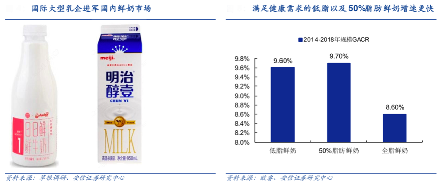 從消費人群來看,90后、95后已經(jīng)成為乳品消費的主力人群,對乳品產(chǎn)品的年輕化、時尚化等提出了更高要求,大部分年輕消費者對食品的健康性、主題性等比較關(guān)注,產(chǎn)品消費的健康化、品質(zhì)化和個性化已經(jīng)成為乳品主力消費人群的“核心消費關(guān)注點”之一。根據(jù)歐睿、安信證券研究中心等綜合資訊表明,滿足健康需求的低脂以及50%脂肪鮮奶增速更快,這些富含健康元素的乳品無益更受歡迎。