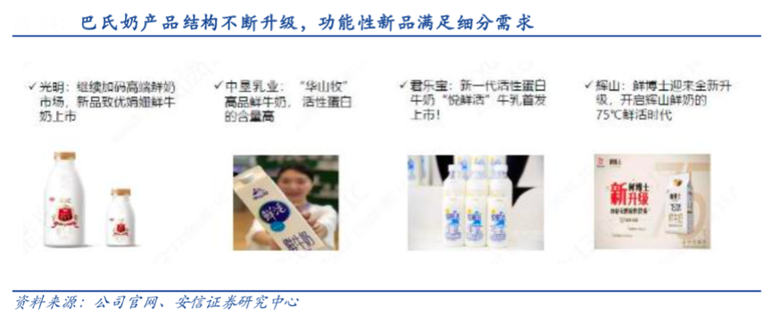 消費升級驅(qū)動著乳品產(chǎn)品結(jié)構(gòu)持續(xù)升級,功能性新品滿足細分需求,乳品的多功能性、健康性等日益明顯。根據(jù)光明官網(wǎng)、安信證券研究中心等綜合資訊表明,乳品巴氏奶產(chǎn)品結(jié)構(gòu)不斷升級,2019年光明的高端鮮奶系列優(yōu)倍、致優(yōu)增 速 20%、50%以上,2019年推出超高端娟珊系列,蛋白質(zhì)含量 3.8g/100ml;新希望推出24小時鮮牛乳,開啟72°C巴氏殺菌時代。