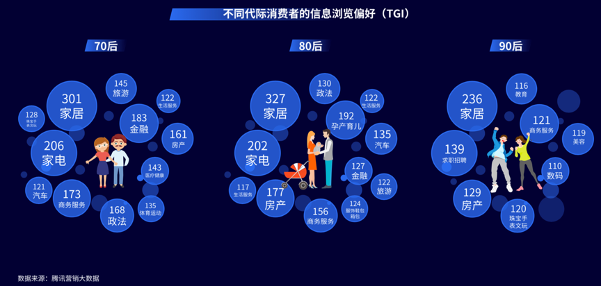 數(shù)字化時代的“內容建設”需要因消費者不同世代而有所不同,“因世代不同”各消費者世代的消費者關注點也不同,優(yōu)秀的家裝新零售電商品牌總能因時而變,提升智能化內容推送率。根據(jù)騰訊營銷大數(shù)據(jù)等綜合資訊表明,70后比較關注家居、家電、金融、商務等內容,80后比較關注家居、家電、孕產(chǎn)育兒、家庭等內容,90后比較關注家居、求職招聘、房產(chǎn)、個人等時尚類內容。