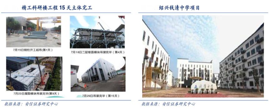 經(jīng)典案例:根據(jù)安信證券研究中心等綜合資訊表明,“精工科研樓”是精工鋼構(gòu)的樣板項目,此科研樓為 3 層建筑,面積 3500 平方米,僅耗時 15 日完成主體工程, 實現(xiàn) 30 日竣工,工程裝配率達到 90%以上,產(chǎn)品集成率達到 85%以上。