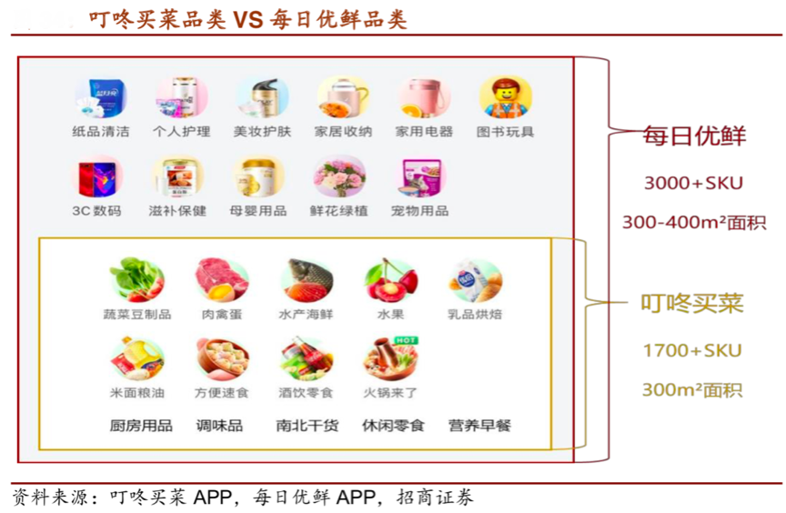 經典案例:據(jù)招商證券等資訊表明,叮咚專注經營“大廚房場景”下的生鮮品類,通過自建分揀倉,提高蔬菜毛利,直接在“賣菜”上賺錢??梢詫崿F(xiàn)水產生鮮鮮活到家,與其他競品形成差異化競爭,將SKU嚴控在 1700+,生鮮占比高達75%-80%,倉內揀貨效率更高,加速商品周轉。