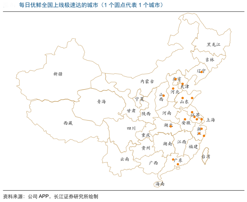 同時,其根據(jù)前置倉普遍面積相對較小、租金成本相對偏低,選址的靈活性也相對更高, 理論上能夠以較快速度、實現(xiàn)對城市更為全面的覆蓋,加之后期開放了前置倉加盟,每日優(yōu)鮮自上線以來極速達覆蓋城市已達到 17 個,城市復(fù)制擴張速度較快。