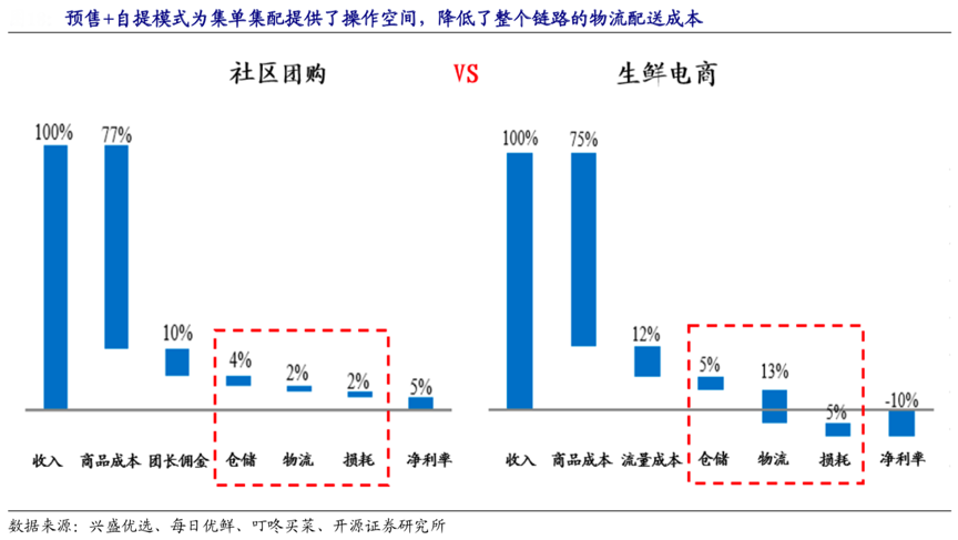 經(jīng)典案例:從興盛優(yōu)選、每日優(yōu)鮮、叮咚買菜、開源證券研究所等綜合資訊表明,相比于前置倉模式的終端配送成本每單在 7-8 元左右,社區(qū)團(tuán)購模式下,從網(wǎng)格倉到提貨點(diǎn)的物流成本可以被壓縮到每單 1 元以內(nèi)。履約成本的大幅降低,也極大增加了商品銷售可觸達(dá)的范圍。