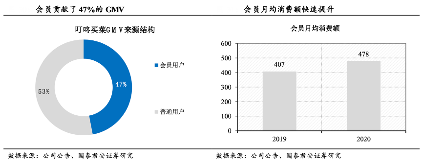 經(jīng)典案例:根據(jù)公司公告、國泰君安證券研究等綜合資訊表明,叮咚買菜會員 GMV 消費金額不斷提高,其會員對平臺的認可度不斷提高,根據(jù)招股書顯示,2021Q1 平均每月交易用戶 690 萬,其中會員占比為 22%(約 152 萬),會員平均每用戶月均單量 6.7 次,GMV 貢獻比 例為 47%。會員的月消費金額由 2019 年的 407 元增長到2020 年的 478 元,呈上升趨勢。