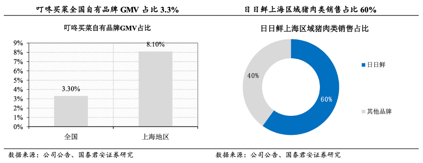 經(jīng)典案例:根據(jù)公司公告、國泰君安證券研究等綜合資訊表明,2021Q1,叮咚買菜公司自有品牌的產(chǎn)品GMV占比為 3.3%,在上海地區(qū)自有品牌占比為8.1%。公司 2020 年 7 月推出自有品牌 Daily Fresh Pork 日日鮮豬肉,2021Q1日日鮮豬肉在上海地區(qū)占豬肉類銷售額的40%以上。