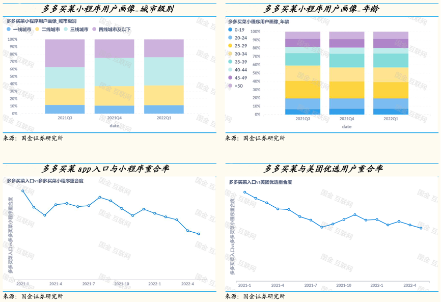 經(jīng)典案例:根據(jù)國金證券研究所等綜合資訊表明,多多買菜在拼多多 App 首頁的中心位置,從首頁入口的社區(qū)團(tuán)購活躍用戶規(guī)模約為拼多多整體用戶規(guī)模的21%,多多買菜的 App 首頁入口活躍用戶規(guī)模和小程序活躍用戶規(guī)模比例約為 3:1,用戶習(xí)慣逐漸養(yǎng)成,兩個渠道的用戶重合度逐漸下降到20%,多多買菜和美團(tuán)優(yōu)選小程序用戶重合率近半年逐漸降低。