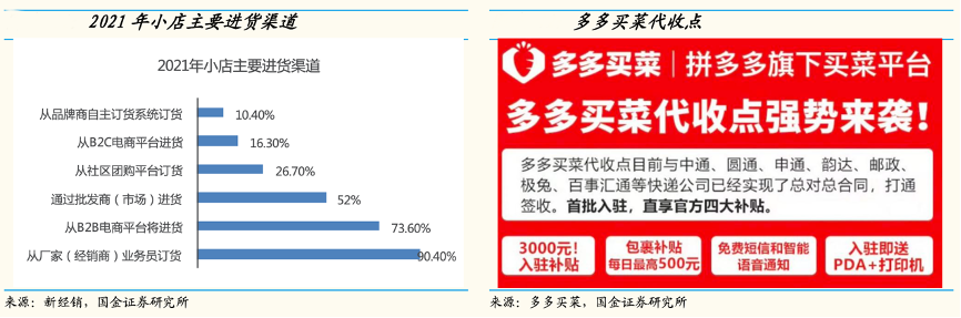 經(jīng)典案例:根據(jù)新經(jīng)銷、多多買菜、國金證券研究所等綜合資訊表明,2021 年 1 月,多多買菜批發(fā)業(yè)務(wù)立項,4月已在東北三省、福建、江浙、廣西等地上線批發(fā)業(yè)務(wù)。以廣東為例,多多買菜廣佛地區(qū)的大件貨SKU已超300,且日單量已超 7 萬,約占中心倉單量的五分之一。批發(fā)業(yè)務(wù)與社區(qū)團(tuán)購的布局形成協(xié)同效應(yīng),提升訂單密度,降低履約成本。