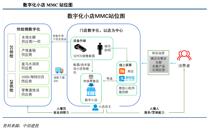 經(jīng)典案例:根據(jù)中信建投等綜合資訊表明,相比于美團的線下地推以及多多買菜的社交裂變,阿里依托零售通背后下沉市場的 100 多萬實體門店資源,一方面將門店數(shù)字化,通過淘寶、支付寶完成線上獲客,另一方面其在選品和供應(yīng)鏈上更加面向下沉市場,固定經(jīng)營場所增加服務(wù)確定性,穩(wěn)定的鄰里關(guān)系提供個性化分層服務(wù),數(shù)字感知設(shè)備入場能讓小店聚攏規(guī)模化需求,反哺生產(chǎn)端,有利于建立基于下沉市場小店模式的社區(qū)團購。
