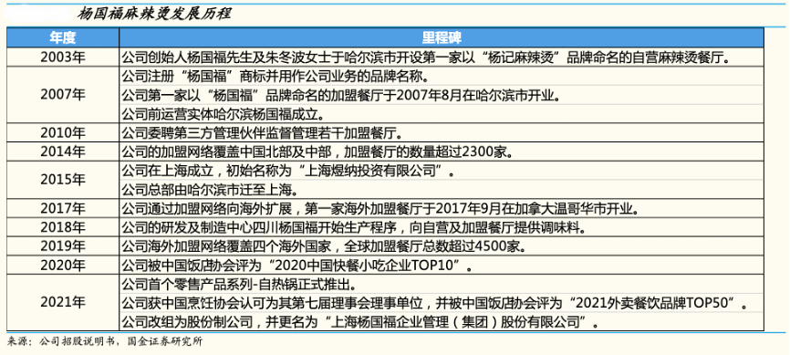 經(jīng)典案例:根據(jù)公司招股說明書、國金證券研究所等綜合資訊表明,楊國福公司成立于 2003 年,歷經(jīng) 19 年的發(fā)展,創(chuàng)新打造“可以喝的麻辣燙”湯底配方、“斤式自選”服務模式和“單人單鍋”烹飪方式,重塑消費者對麻辣燙的觀感。根據(jù)弗若斯特沙利文數(shù)據(jù),按商品交易總額以及餐廳數(shù)量計算,2020年公司以 49 億商品交易額、5238 家門店在國內(nèi)中式快餐市場排名第一,市占率約 0.7%。