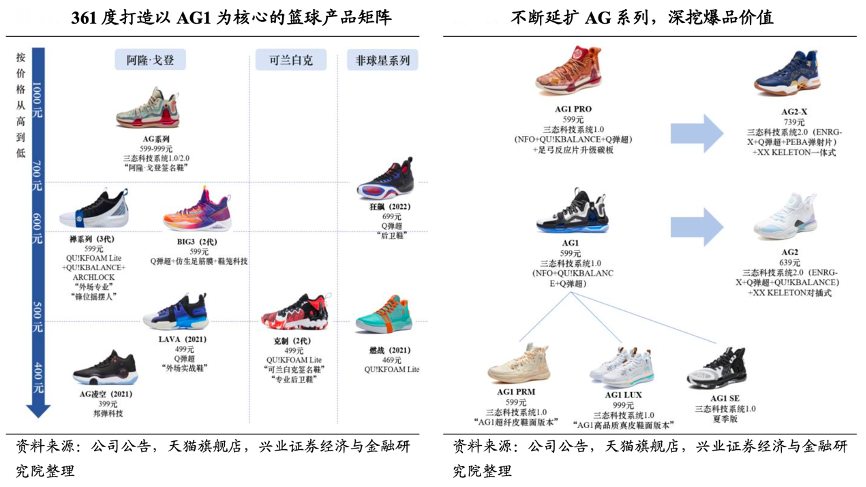 經(jīng)典案例:根據(jù)公司公告、天貓旗艦店、興業(yè)證券經(jīng)濟(jì)與金融研究院等綜合資訊表明,2021年雙十一期間,AG1 系列銷(xiāo)量達(dá) 10 萬(wàn)雙,直接帶動(dòng)流水約 3000 萬(wàn)元。361度深度開(kāi)發(fā) AG1 的產(chǎn)品潛力,設(shè)計(jì)多類(lèi)型 AG1 衍生款,包括專(zhuān)業(yè)性能更優(yōu)的 AG1 PRO,匹配不同穿搭需求的真皮版本和超纖皮革版本以及夏季輕薄版本 AG1 SE。同時(shí),打造多款 AG 系列支線(xiàn)鞋款,包括適用外場(chǎng)的禪系列和 LAVA,以及 AG 凌空等鞋款,皆憑借科技感與設(shè)計(jì)性俘獲口碑?;@球品類(lèi)近年來(lái)營(yíng)收增速快速增長(zhǎng),2021年籃球鞋類(lèi)產(chǎn)品銷(xiāo)售量超 20 萬(wàn)雙,零售額約 7063 萬(wàn)元。