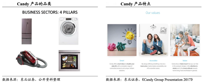 經典案例:根據東北證券、公開資料、《Candy Group Presentation 2017》等綜合資訊表明,Candy市場定位于大眾端,注重產品的性價比、智能化以及意式風格,其產品端有洗衣機、洗干衣機、洗碗機、滾筒干衣機、冰箱、冰柜、廚房電器及吸塵清潔設備等。Candy主打洗衣機以及廚具產品,旗下的核心品牌 Hoover 主打吸塵器等小家電。收購 candy 之后,其對歐洲品牌矩陣進行了重新梳理,Haier作為高端品牌;Hoover作為中高端品牌;Candy作為大眾品牌,以便更好地覆蓋目標客戶群。