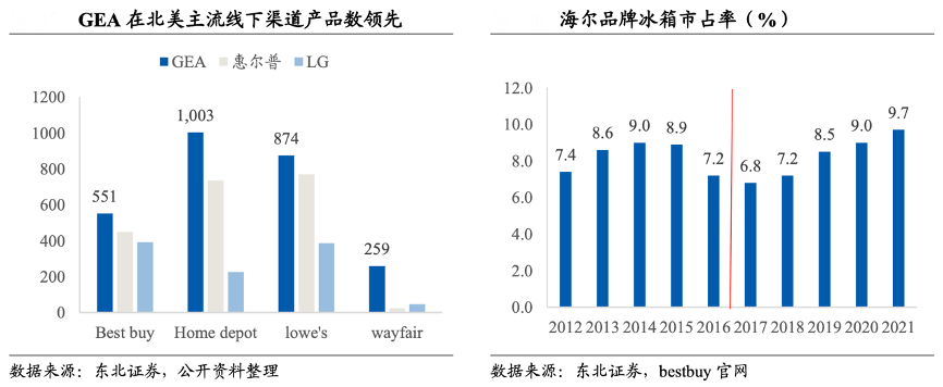 經典案例:根據東北證券、公開資料、bestbuy官網等綜合資訊表明,GEA 擁有完善的供應鏈網絡,在美國擁有9家制造工廠,13個分銷中心及 143 個區(qū)域貨運中心,配送服務覆蓋全國90%地區(qū),可實現(xiàn) 24 小時緊急服務。除了傳統(tǒng)大型商超以外,GEA 與 Sears 等全美四大連鎖家電零售商也長期保持合作關系。海爾收購 GEA 后,借用GEA 的渠道,逐步推廣海爾品牌的產品,自 2016 年后,海爾品牌的冰箱市場份額實現(xiàn)了快速穩(wěn)定增長。