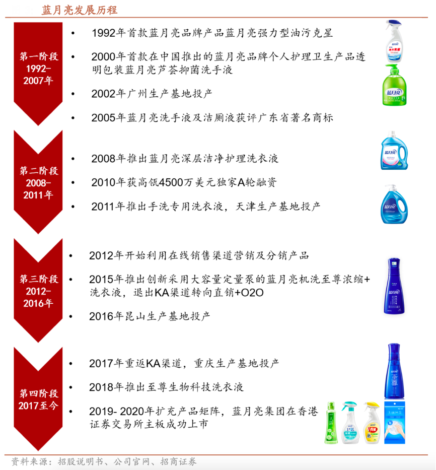 經(jīng)典案例:根據(jù)招股說明書、公司官網(wǎng)、招商證券等綜合資訊表明,藍(lán)月亮于2008年在全國率先推廣洗衣液,改變十余億中國人的洗衣習(xí)慣,推動(dòng)洗衣粉轉(zhuǎn)向洗衣液的跨越式升級;于2011年推出藍(lán)月亮手 洗專用洗衣液,倡導(dǎo)專品專用清潔理念;于2015年推出藍(lán)月亮機(jī)洗至尊濃縮+洗衣液,在國內(nèi)屬采用濃縮技術(shù)的第一梯隊(duì),再次推動(dòng)中國洗滌行業(yè)市場變革,由普通型洗衣液跨越升級為濃縮型洗衣液。
