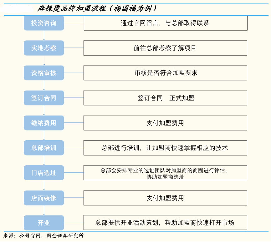經(jīng)典案例:根據(jù)公司官網(wǎng)、國金證券研究所等綜合資訊表明,行業(yè)龍頭品牌主要采用“供應(yīng)鏈-加盟商-消費(fèi)者(S2B2C)”模式進(jìn)行快速拓店,代表如楊國福、 張亮。其加盟商能夠發(fā)揮當(dāng)?shù)剡x址、攬客、用工等優(yōu)勢,且自負(fù)盈虧使得其經(jīng)營過程中更具主觀能動性。根據(jù)楊國福招股說明書和張亮麻辣燙官網(wǎng)披露數(shù)據(jù),楊國福截至 3Q21 末的 5783 家餐廳中僅 3 家直營店、其余均為加盟店,張亮麻辣燙目前 5000+門店中直營僅 100+。