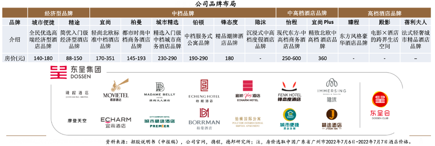 經(jīng)典案例:根據(jù)招股說明書、公司官網(wǎng)、攜程、德邦研究所等綜合資訊表明,東呈酒店聚焦大眾出行住宿市場,為大眾出行者提供高性價(jià)比住宿體驗(yàn),目前已累計(jì)開發(fā) 13 個(gè)自主品牌、接近 30 項(xiàng)酒店產(chǎn)品,已形成覆蓋經(jīng)濟(jì)型(2個(gè))、中檔(6個(gè))、中高檔(2個(gè))和高檔(3個(gè))的酒店品牌體系,其中檔酒店定價(jià)相對更低,也與全季等其他酒店集團(tuán)中端產(chǎn)品形成差異化競爭。